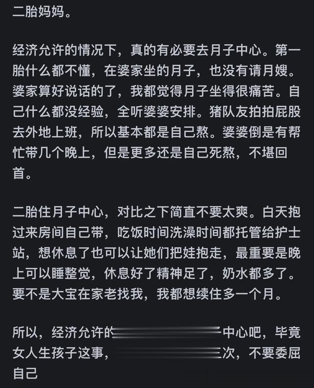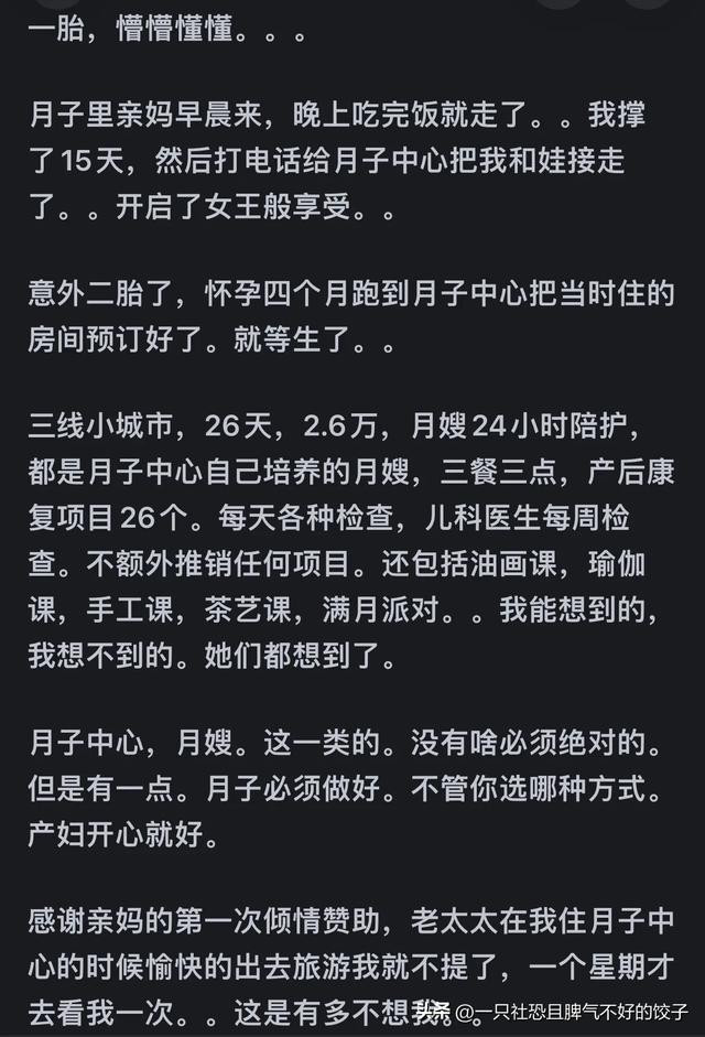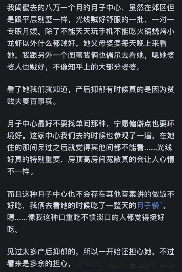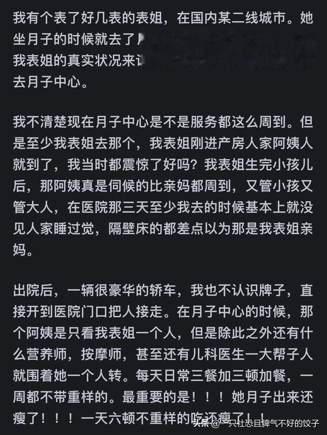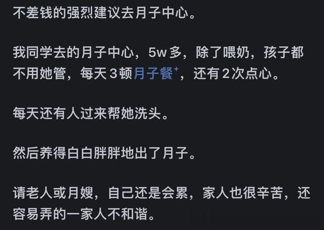 我妈也说了,一般人家也就是舒服一个月,回家就是落差。有钱人是出了月子中心回家月嫂保姆相继上岗,一点落差都没有。
